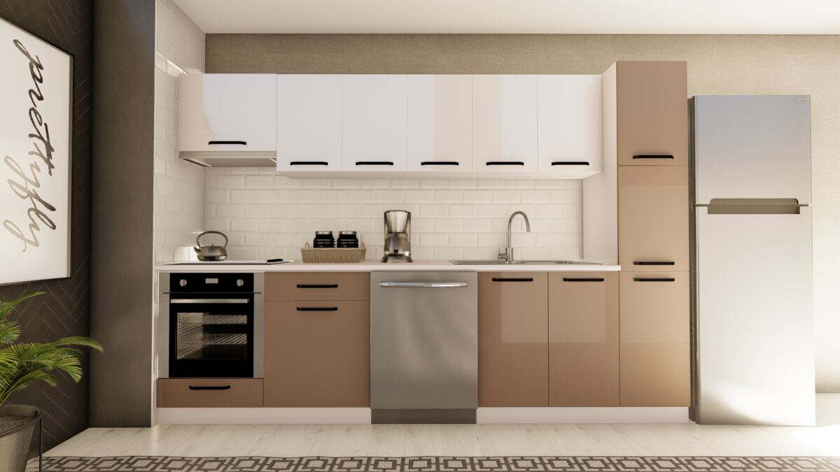 VİSAS CONCEPT _ 300 cm ALMİRA HAZIR MUTFAK DOLABI ASPİRATÖR, ANKASTRE ve KİLER MODÜLLÜ PARLAK BEYAZ ve CAPPUCCİNO