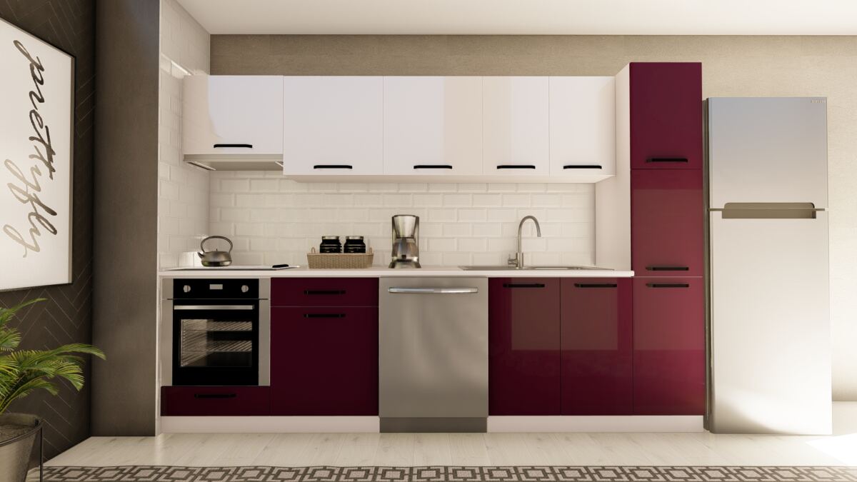 VİSAS CONCEPT _ 300 cm DEREN HAZIR MUTFAK DOLABI ASPİRATÖR, ANKASTRE ve KİLER MODÜLLÜ PARLAK BEYAZ ve MÜRDÜM