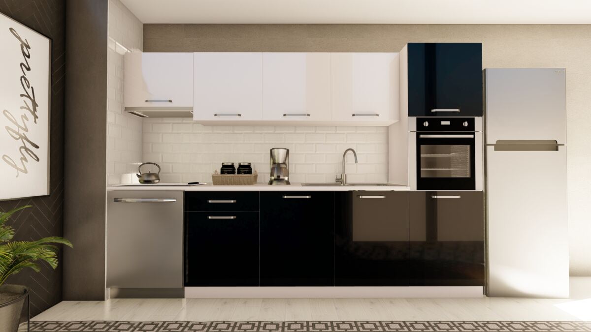VİSAS CONCEPT _ 300 cm ZEYTİN HAZIR MUTFAK DOLABI ASPİRATÖR ve ANKASTRE KİLER MODÜLLÜ PARLAK BEYAZ ve SİYAH