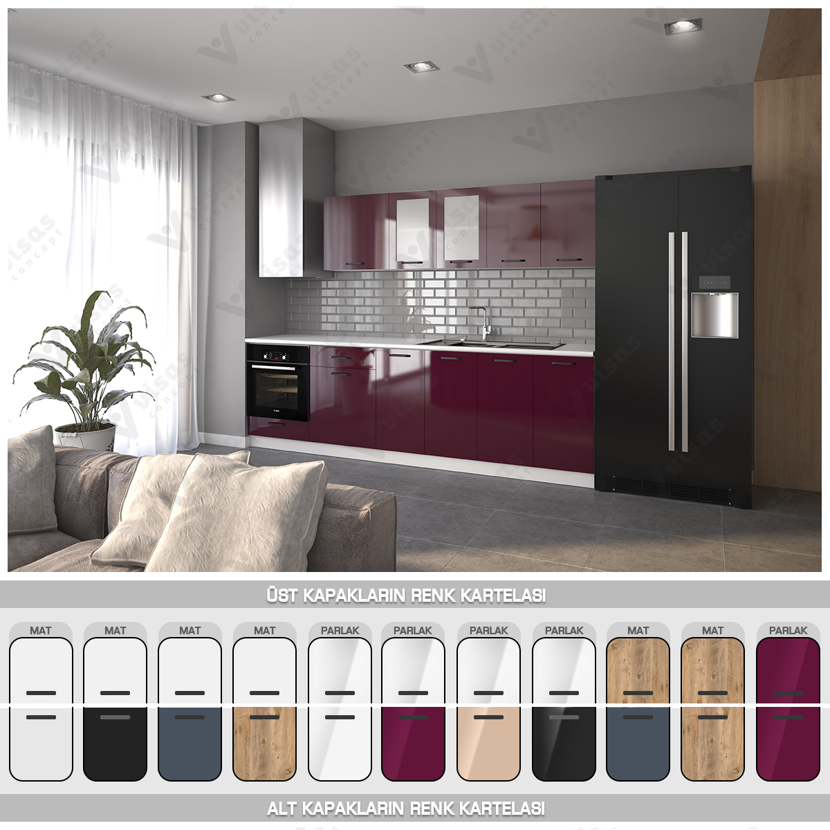 VİSAS CONCEPT_NİLÜFER HAZIR MUTFAK DOLABI_Parlak HIGH-GLOSS__ Ankastre Modüllü_Cam Kapaklı_Mürdüm_280 cm