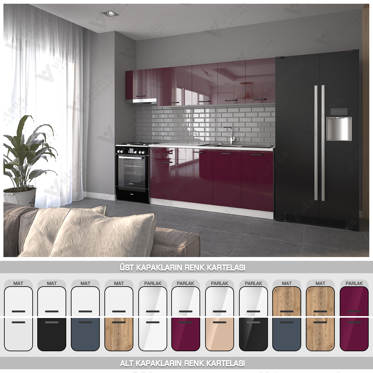 VİSAS CONCEPT_SÜMBÜL HAZIR MUTFAK DOLABI_Parlak HIGH-GLOSS_Aspiratör Modüllü_Mürdüm_240 cm