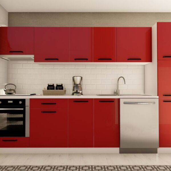 300 cm ASYA HAZIR MUTFAK DOLABI ASPİRATÖR, ANKASTRE ve KİLER MODÜLLÜ PARLAK KIRMIZI